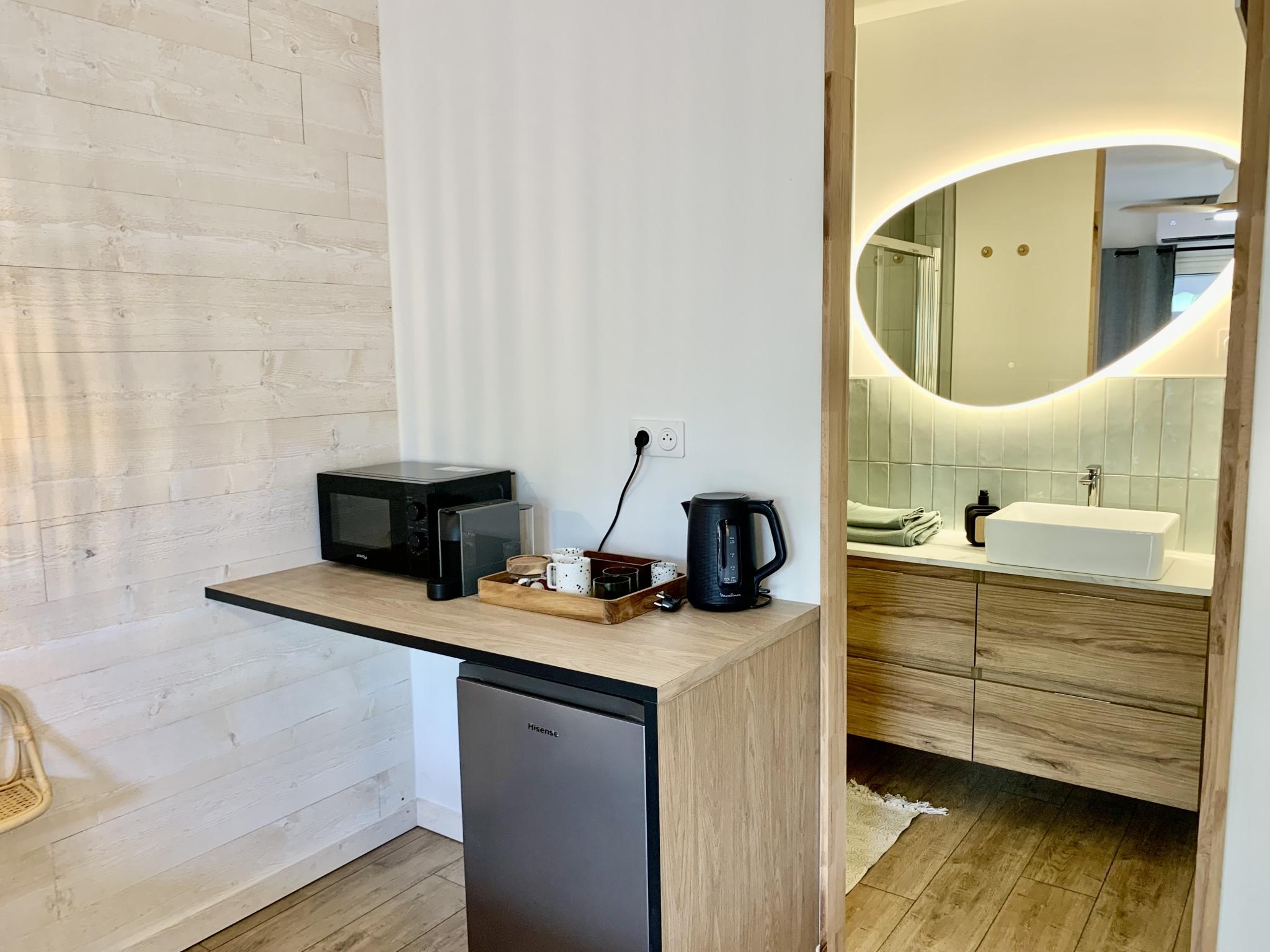 - Coin café avec machine à café Nespresso, dosettes, bouilloire électrique, thé et sucre fournis,réfrigérateur top et micro-ondes.
