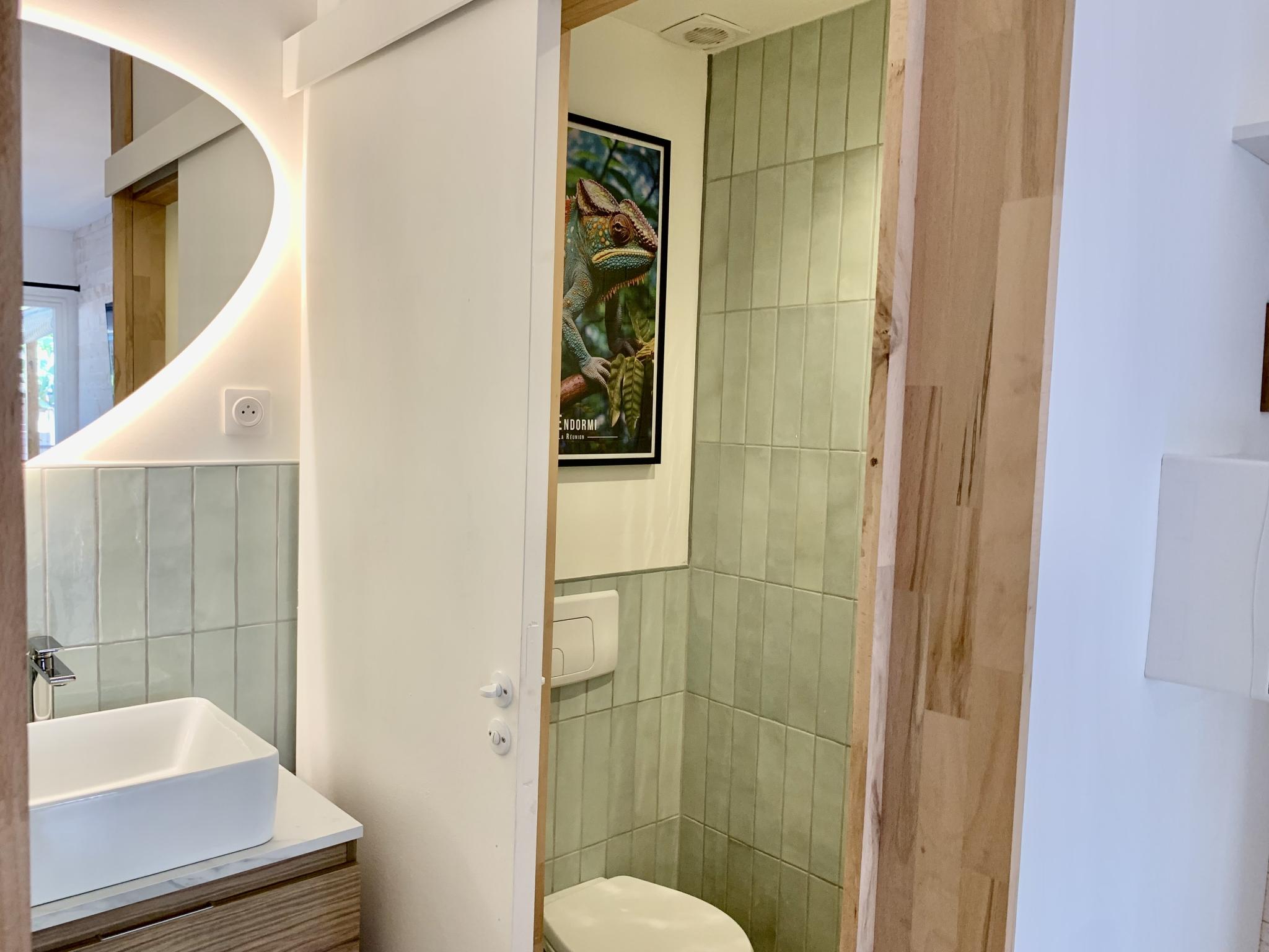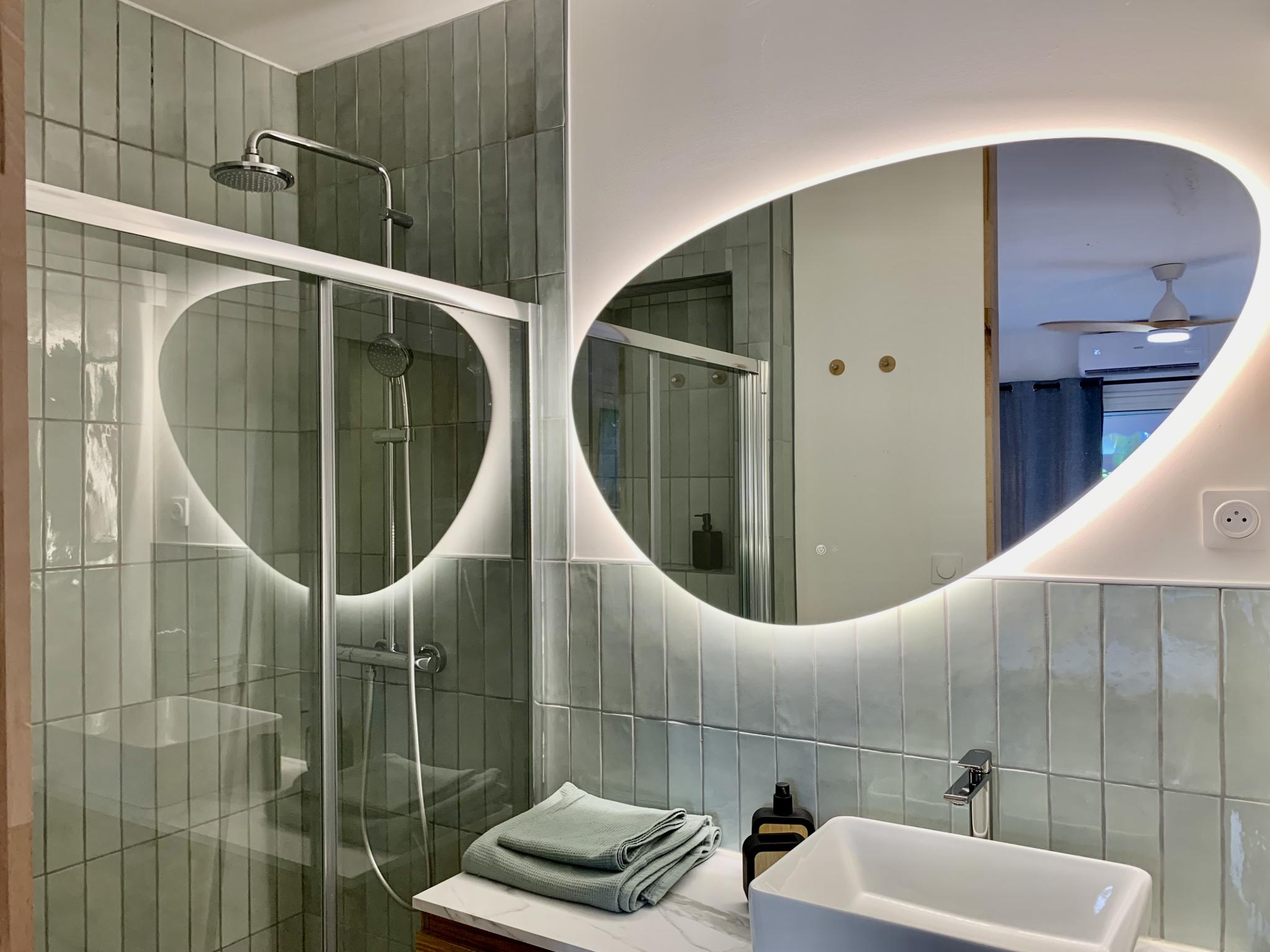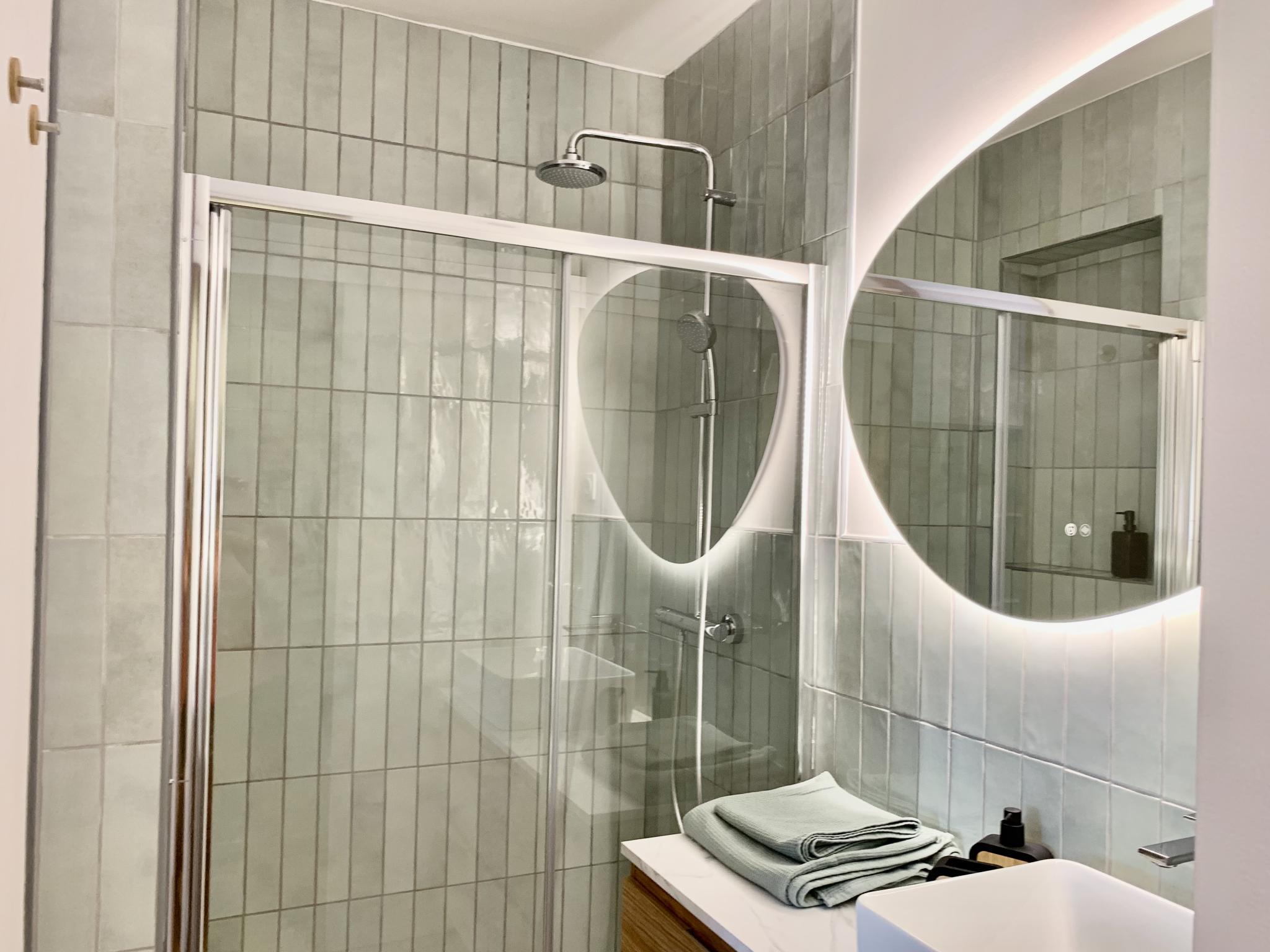 - Une salle d’eau avec douche italienne entièrement carrelée, 1 vasque et un miroir, sèche-cheveux et produits d’hygiène à disposition. Les serviettes de toilette sont fournies.