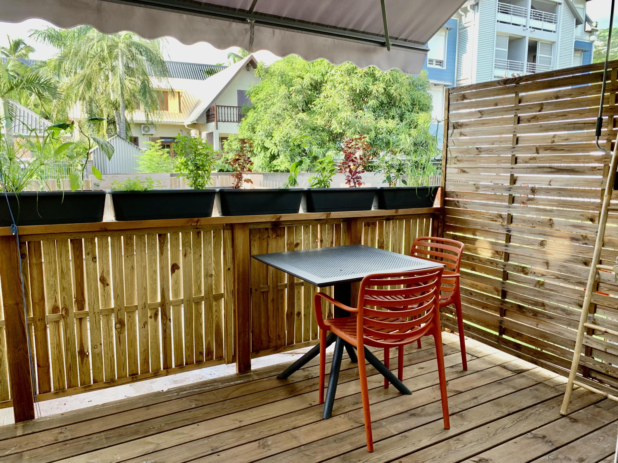 - Une terrasse fermée par claustras avec deux fauteuils et sa table basse, idéale pour les apéritifs.
